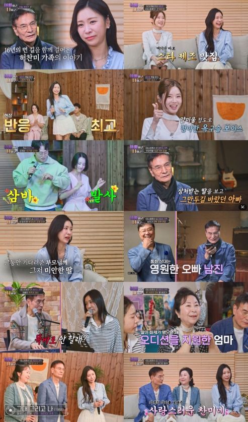 한편, 허찬미 가족은 경연을 응원해 준 ‘든든한 지원군’ 허찬미 이모와 허찬미 아버지의 제자인 가수 박우철, 허준을 초대해 화려한 한 상을 대접했다. 허찬미는 몸을 사리지 않으며 딸을 응원한 부모님과 든든한 지원군에게 고마운 마음을 표현했다. 특히 경연에 출전한 딸과 아내의 매니저 역할 때문에 체중시 4kg 빠지며 기다림 전문이 된 허찬미 아버지는 “기다리는 건 사귈 때부터 몇 시간이고 기다렸다”며 연애 시절을 회상했다. 허찬미 부모님은 음악을 하다 만나게 됐지만, 허찬미 아버지는 장인어른이 “딴따라와는 결혼 못 시킨다”라며 목회를 권유하자 사랑을 위해 가수의 꿈을 버리고 목사의 길을 걸었다. 남편의 꿈을 되찾아주고 싶었던 허찬미 어머니는 결혼 5년 만에 ‘둘바라기’라는 듀엣 그룹으로 함께 음반을 발매하며 꿈을 이뤘다. 허찬미 아버지는 “가수 안 된 거 절대 후회 안 하는데, 집사람은 가수 못 시킨 게 후회가 되고 안타깝다. 늘 미안하다”고 자신의 꿈보다 아내 걱정을 먼저 하며 눈시울을 붉혀 감동을 자아냈다. 허찬미 부모님은 부모님의 꿈을 이어받은 딸이 꿈을 포기하지 않고 이어가길 응원했고, 드라마 같은 이야기에 스튜디오는 “현실에 있는 가족 같지 않다”며 감동했다. 딸 덕분에 스튜디오를 찾은 허찬미 부모님은 딸과 함께 소리새의 ‘그대 그리고 나’를 함께 열창하는 무대로 미처 이루지 못했던 가수의 꿈을 펼쳐내며 특별한 순간을 함께 했다.