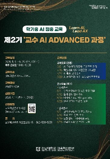 신청은 2026년 4월 14일부터 4월 24일까지 교육혁신본부 누리집 내 AI ADVANCED 과정 게시판을 통해 신청할 수 있다.