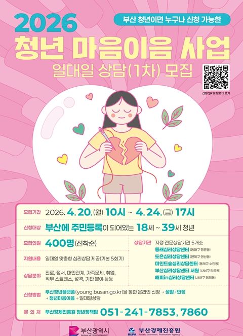 (포탈뉴스통신) 부산시는 정서적으로 어려움을 겪는 청년들의 마음 회복을 돕기 위해 '2026년 청년 마음이음 사업' 참여자를 모집한다고 밝혔다.