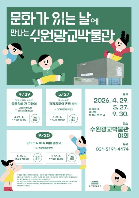 (포탈뉴스통신) 수원광교박물관은 4·5·9월 ‘문화가 있는 날’(매달 마지막 주 수요일)에 박물관 야외에서 어린이와 가족 관람객을 위한 무료 공연을 연다.