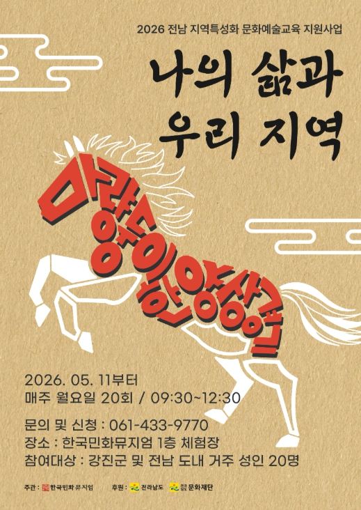 (포탈뉴스통신) 강진군 대구면에 있는 한국민화뮤지엄이 ‘2026 지역특성화 문화예술교육 지원사업’ 선정에 따라 오는 5월 11일부터 ‘나의 삶과 우리 지역–마량둥이의 한양 상경기’ 프로그램 운영을 시작하며 참가자를 모집한다.