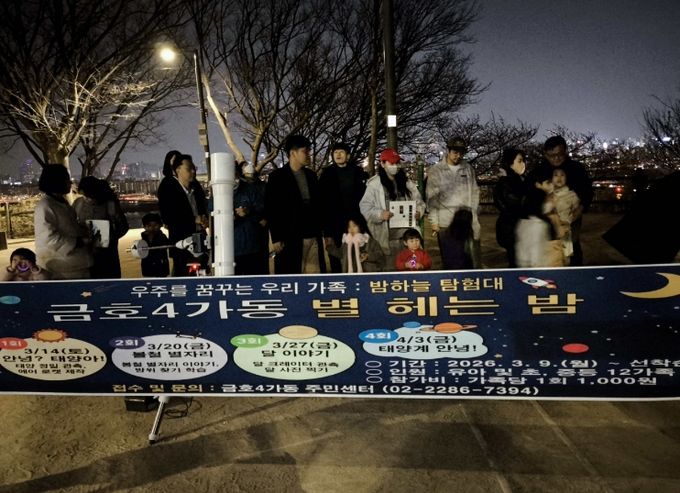 (포탈뉴스통신) 서울 성동구 금호4가동에서는 지난 3월 14일부터 4월 3일까지 총 4회에 걸쳐 진행된 주민참여예산 사업 '별 헤는 밤' 프로그램이 주민들의 뜨거운 호응 속에 성공적으로 마쳤다고 밝혔다.
