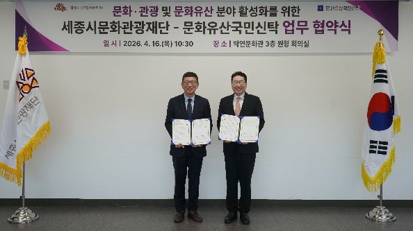 이날 협약식에는 박영국 세종시문화관광재단 대표이사와 이상현 문화유산국민신탁 이사장이 참석해, 양 기관 협력 강화를 통한 문화·관광 및 문화유산 분야 발전과 시민 문화 향유 기회 확대에 뜻을 모았다.