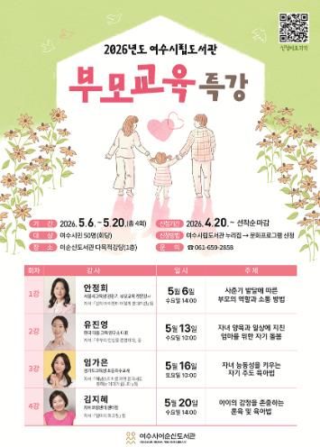 (포탈뉴스통신) 여수시립도서관은 가정의 달을 맞아 부모 역할의 이해와 올바른 자녀 양육에 도움을 주기 위해 ‘부모 교육 특강’을 운영한다.
