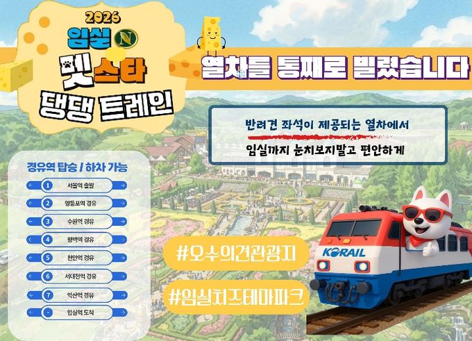 (포탈뉴스통신) 임실군이 오는 5월 1일부터 3일까지 3일간 개최되는 ‘2026 임실N펫스타’를 앞두고, 반려견과 함께 떠나는 특별 전용 열차 상품인 ‘임실N펫스타 댕댕트레인’을 운영한다고 밝혔다.