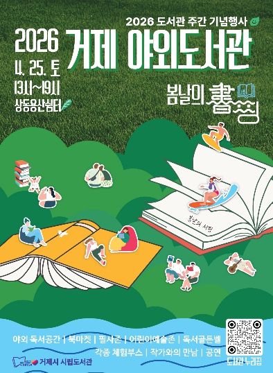 (포탈뉴스통신) 거제시 시립도서관은 4월 도서관 주간을 맞아 오는 4월 25일 상동동 용산쉼터에서 시민 참여형 야외 독서문화 행사인 2026 거제 야외도서관 『봄날의 書(서)핑』을 개최한다.