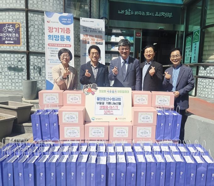 (포탈뉴스통신) 의정부시 장암동주민센터는 4월 16일 물댄동산수림교회가 부활절을 맞아 지역 내 어려운 이웃을 위해 ‘기쁨나눔선물 세트’와 마스크 50상자를 기탁했다고 밝혔다.