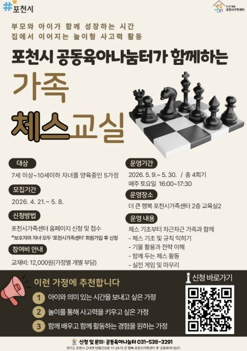 (포탈뉴스통신) 포천시 더 큰 행복 포천시가족센터는 공동육아나눔터 상시 프로그램의 일환으로 아동의 논리적 사고력 향상과 부모-자녀 간 긍정적 상호작용을 지원하기 위해 가족 참여형 체스 프로그램 '가족 체스 교실'을 운영한다고 밝혔다.