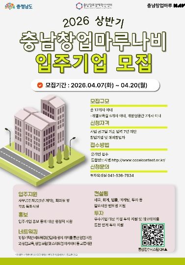(포탈뉴스통신) (재)충남창조경제혁신센터는 이달 20일까지 2026년 충남창업마루나비 입주기업을 모집한다고 밝혔다.