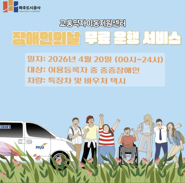 (포탈뉴스통신) 파주도시공사 교통약자이동지원센터에서는 오는 4월 20일 장애인의 날을 맞아 교통약자를 위한 무료 운행 서비스를 실시한다.