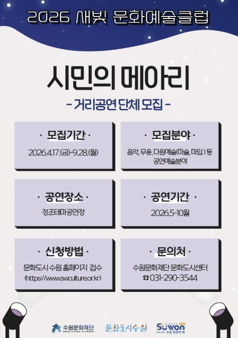 (포탈뉴스통신) 수원문화재단은 지역 공연예술의 활성화와 수원시민의 주체적 문화예술 참여를 위해 ‘새빛 문화예술클럽 '시민의 메아리'’ 사업에 참여할 생활예술단체를 모집한다.