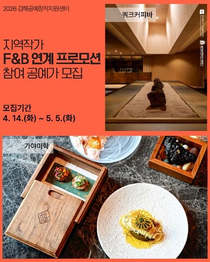 (포탈뉴스통신) (재)김해문화관광재단클레이아크김해미술관에서 운영하고 있는 김해공예창작지원센터는 '지역작가 F·B 연계 프로모션'에 참여할 공예가 모집을 지난 14일부터 시작해 오는 5월 5일(화)까지 진행한다고 밝혔다.