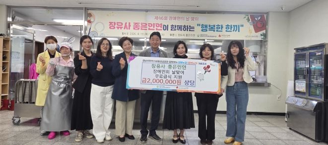 장유사 "좋은인연" 손해진 회장은 “제46회 장애인의 날을 맞이하여 서부지역 장애인들에게 맛있는 밥상을 선물할 수 있고 동참할 수 있어 기쁘다. 맛있는 밥상을 위해 노력하여주신 서부장애인종합복지관 관장 이하 직원분들게 감사하다. 더욱 건강하고 행복한 하루가 되시길 바란다”고 전했다.