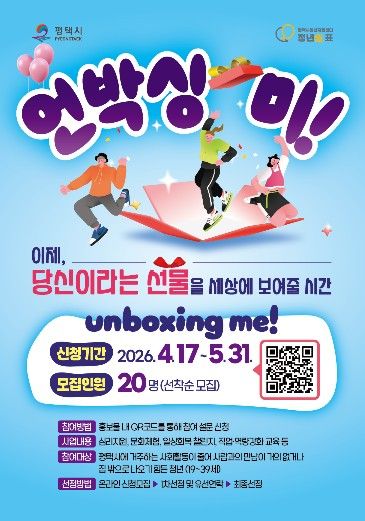 (포탈뉴스통신) 평택시 청년지원센터는 4월 17일부터 5월 31일까지 평택시에 거주하는 사회활동이 줄어 사람과의 만남이 거의 없거나 집 밖으로 나오기 힘든 청년의 일상 회복과 사회 참여 촉진을 위해 실시하는 지원사업 '언박싱 미!' 참여자를 모집한다.