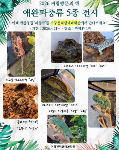 (포탈뉴스통신) 거창군은 거창천적생태과학관에서 2026년 ‘거창방문의 해’를 맞아 오는 21일부터 어린이와 학생, 가족 관람객을 대상으로 이색 애완 파충류 전시를 개최한다고 밝혔다.