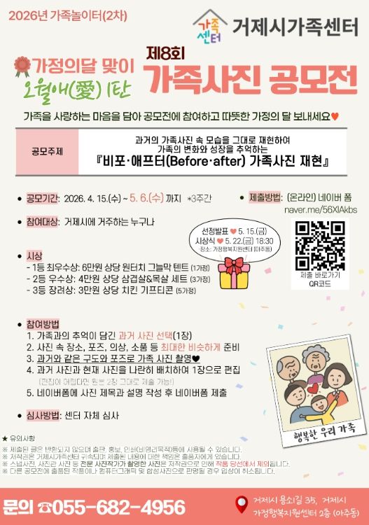류주진 센터장은 “이번 공모전을 통해 가족들이 서로 소통하고 추억을 나누는 기회가 더욱 많아지길 기대한다”며, “거제시민들의 많은 관심과 참여를 바란다”고 전했다.