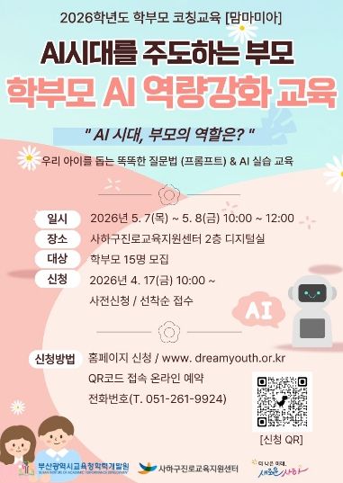 (포탈뉴스통신) 사하구진로교육지원센터는 오는 5월 7일부터 5월 8일까지 양일간 학부모를 대상으로 'AI 시대, 부모의 역할은?' 특강을 운영한다.