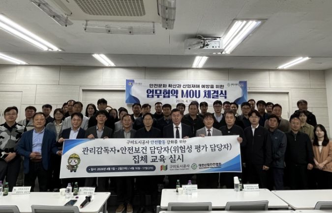(포탈뉴스통신) 구미도시공사는 대한산업안전협회와 산업현장 안전문화 확산 및 근로자 산업재해 예방을 위한 업무협약(MOU)을 체결하고, 안전 중심의 경영체계 구축을 위한 협력에 나섰다.