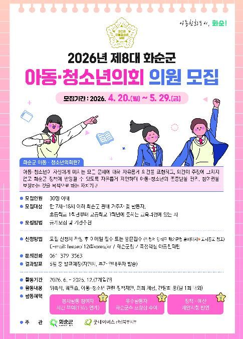 (포탈뉴스통신) 화순군은 ‘2026년 제8대 화순군 아동·청소년의회’ 의원 30명을 오는 4월 20일부터 5월 29일까지 공개 모집한다고 밝혔다.