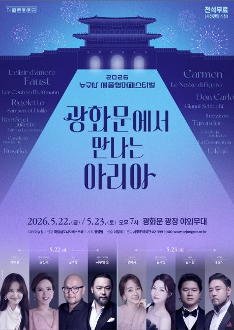 (포탈뉴스통신) 세종문화회관은 서울시민 누구나 즐길 수 있는 세종 썸머 페스티벌 '광화문에서 만나는 아리아'를 오는 5월 22일과 23일, 양일간 광화문 광장에서 개최한다. 광화문 광장은 시민 중심의 공간으로 새롭게 거듭난 이후 서울을 대표하는 문화 명소로 자리해 왔으며, 그 중심에서 세종문화회관은 한국 문화예술을 상징하는 공간으로 자리해 왔다. 이러한 공간적 맥락 속에서 세종문화회관과 광화문 광장은 문화의 전통성과 동시대성을 함께 품은 열린 문화예술 플랫폼으로 그 의미를 확장해가고 있다.