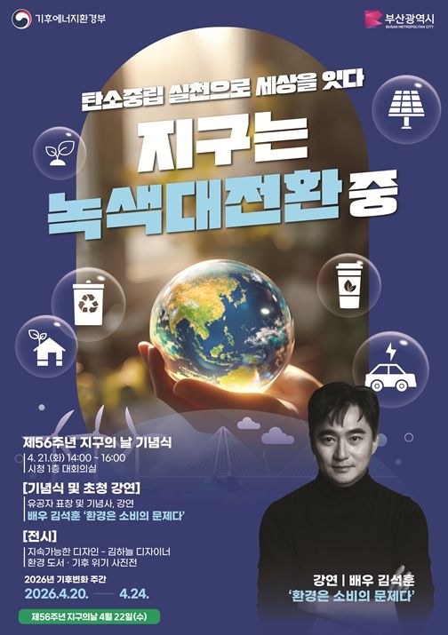 (포탈뉴스통신) 부산시는 '제56주년 지구의 날(4월 22일)'을 맞아 오늘(20일)부터 24일까지 '제18회 기후변화주간'을 운영하고, '지구는 녹색대전환 중. 탄소중립 실천으로 세상을 잇다'를 주제로 다양한 행사를 개최한다고 밝혔다.