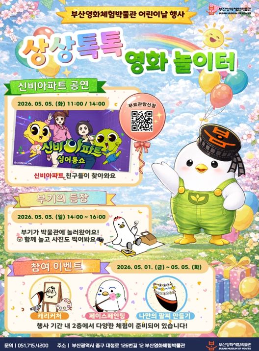 (포탈뉴스통신) 부산시는 부산영화체험박물관(관장 박채성, 중구 소재)에서 어린이날을 맞아 어린이와 가족 관람객을 위한 특별 행사 '상상톡톡 영화 놀이터 : 다 같이 놀자!'를 오는 5월 1일부터 5일까지 5일간 개최한다고 밝혔다.