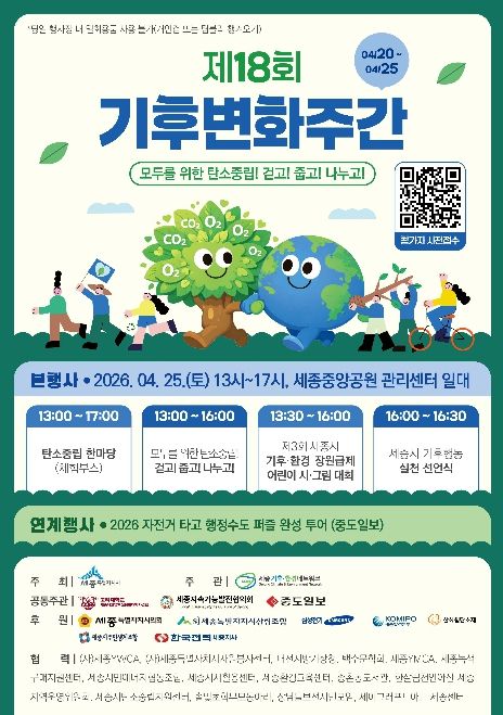 (포탈뉴스통신) 세종특별자치시가 20일부터 25일까지 6일간 중앙공원 일대에서 ‘제18회 기후변화주간’ 행사를 개최한다.