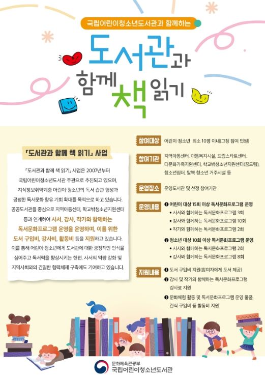 ‘도서관과 함께 책 읽기’는 지식정보 취약계층 어린이를 대상으로 독서문화 활성화를 위해 프로그램을 운영할 수 있도록 국립어린이청소년도서관이 예산 등을 지원하는 사업으로, 전국 공공도서관 120개관(어린이 대상 110개관, 청소년 대상 10개관)에서 함께 추진된다.