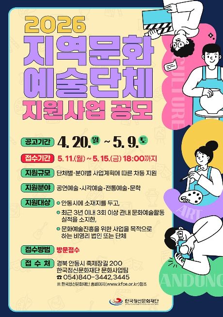 (포탈뉴스통신) 안동시 한국정신문화재단은 5월 11일부터 5월 15일 18시까지 관내 문화예술단체를 대상으로 ‘지역문화예술단체 지원사업’ 참여단체를 공개 모집한다.