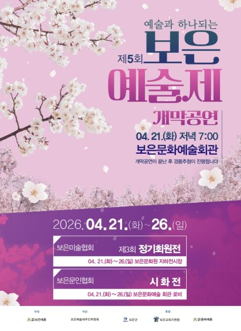 이경숙 문화관광과장은 “이번 보은예술제가 군민들이 일상 속에서 문화와 예술을 가까이에서 즐기고 공감할 수 있는 시간이 되길 바란다”며 “다양한 전시와 공연이 어우러진 이번 행사가 지역에 따뜻한 활력을 더하길 기대한다”고 말했다.