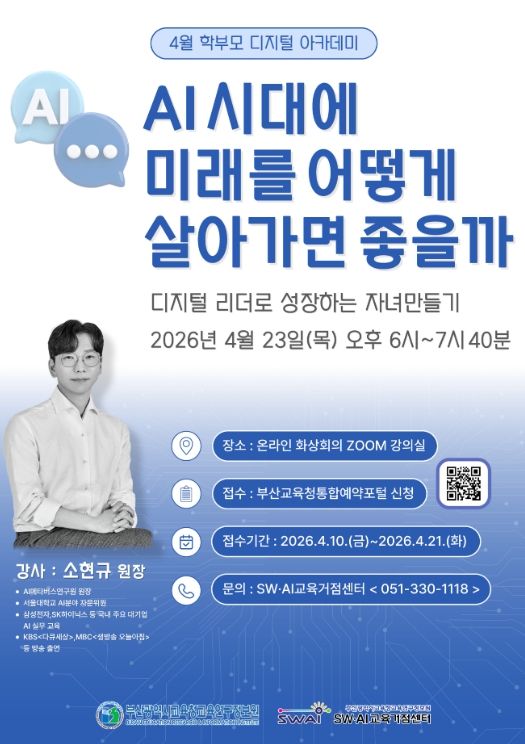 (포탈뉴스통신) 부산광역시교육청교육연구정보원은 오는 23일 관내 학부모와 시민을 대상으로 온라인(ZOOM)을 통해 4월 학부모 아카데미 ‘AI시대에 미래를 어떻게 살아가면 좋을까?’를 운영한다.