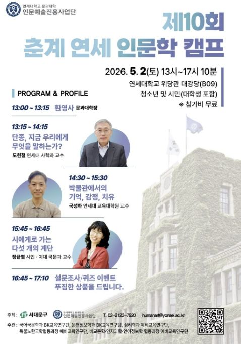 (포탈뉴스통신) 서대문구가 연세대학교 문과대학과 공동으로 5월 2일 오후 1시부터 5시 10분까지 연세대 위당관 대강당(B09호)에서 ‘제10회 연세 인문학 캠프’를 개최한다.