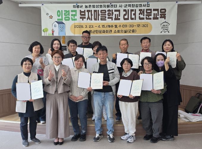 (포탈뉴스통신) 의령군은 지난 3월부터 추진해 온 ‘2026년 부자마을학교 리더 전문교육’을 마무리하고 12명의 수료생을 배출했다고 밝혔다.