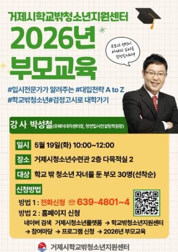 (포탈뉴스통신) 거제시학교밖청소년지원센터에서는 5월 19일 학교 밖 청소년 자녀를 둔 부모를 대상으로'2026년 학교 밖 청소년 부모교육'을 실시한다고 밝혔다.