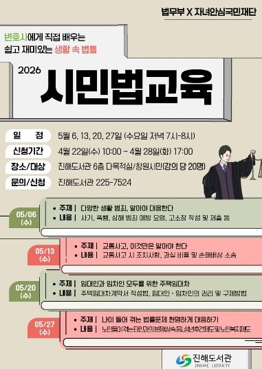 (포탈뉴스통신) 창원특례시 진해도서관(과장 이영화)은 오는 5월 매주 수요일 저녁 7시에 시민의 법률 이해도 향상과 일상 속 법적 문제 대응을 돕기 위해 ‘2026년 시민법교육’을 운영한다고 밝혔다.