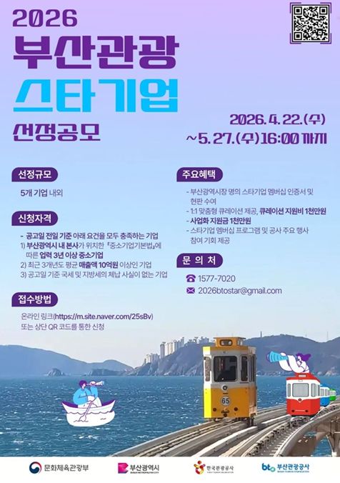 (포탈뉴스통신) 부산시와 부산관광공사는 부산관광기업지원센터가 외국인 관광객 500만 시대를 선도할 지역 관광산업의 핵심 주역을 발굴하기 위해 '2026 부산관광 스타기업 공모'를 실시한다고 밝혔다.