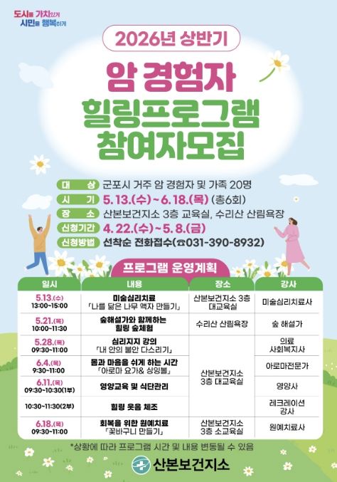 (포탈뉴스통신) 군포시 산본보건지소는 오는 5월 13일부터 6월 18일까지 총 6회에 걸쳐 암 경험자와 그 가족 20여 명을 대상으로 암 경험자 자조모임인 ‘봄·봄·봄 프로그램’을 운영한다.