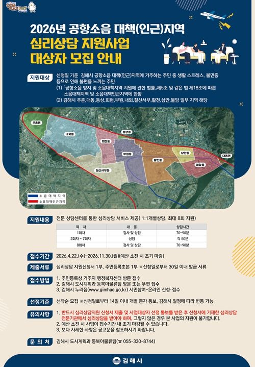 (포탈뉴스통신) 김해시는 공항소음 대책(인근)지역 주민을 대상으로 심리상담 지원사업 참여자를 모집한다고 22일 밝혔다.