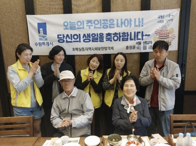 이번달 주인공은 독거 어르신으로 호매실동 소재 훈장골에서 별도로 준비한 미역국과 맛있는 식사를 대접했고, 윤쉐프 정직한 제빵소에서 후원하는 케이크를 전달했다. 행사에 참여한 협의체 위원들은 생일 축하 노래를 부르며 어르신과 정겨운 시간을 보냈다.