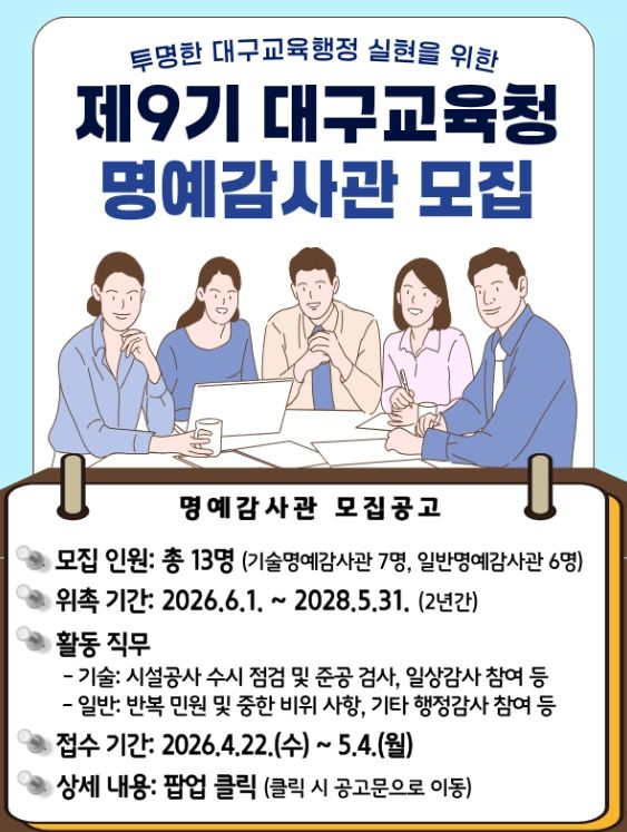 (포탈뉴스통신) 대구시교육청은 시민 참여를 통해 감사의 공정성과 투명성을 높이기 위해 ‘제9기 명예감사관’ 13명을 공개 모집한다고 밝혔다.