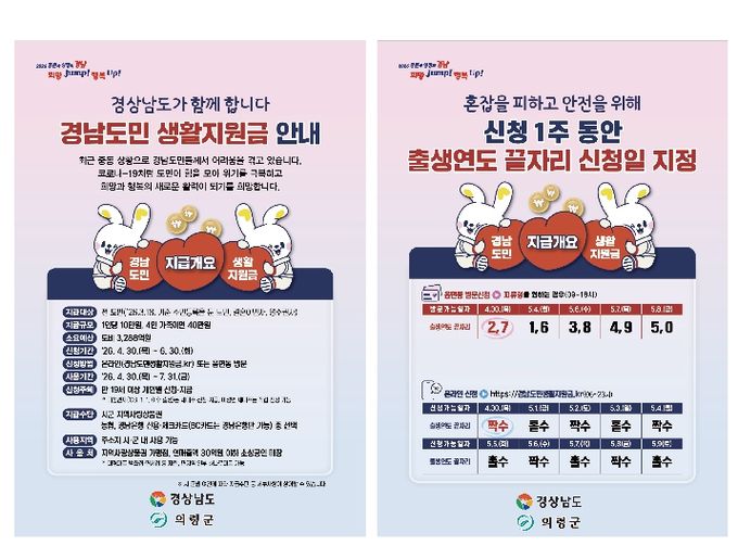 군 관계자는 “경남도민 생활지원금이 지역 내 소비 촉진과 소상공인 매출 회복에 도움이 되기를 기대한다”며 “군민들이 편리하고 안전하게 신청할 수 있도록 사전 준비와 홍보에 최선을 다하겠다”고 말했다.