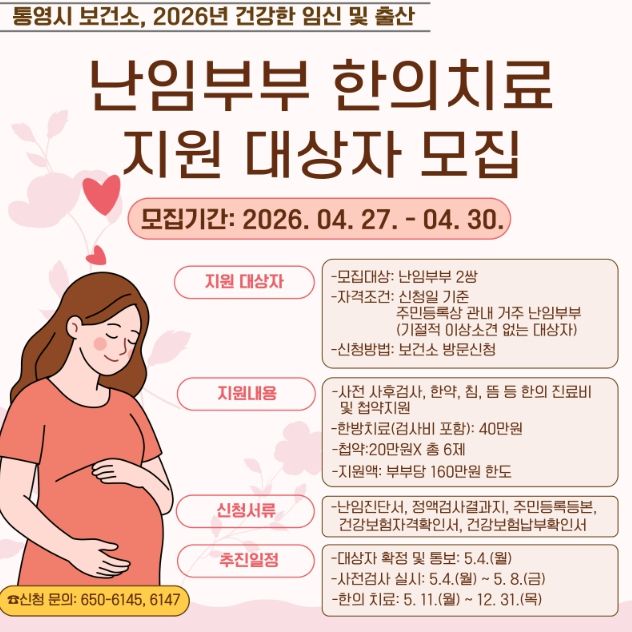 지원대상은 난임 검사에서 기질적 이상 소견이 없는 관내 난임부부 2쌍이다. 모집 기간은 오는 27일부터 30일까이며, 통영시 보건소 모자보건실을 방문해 신청하면 된다.