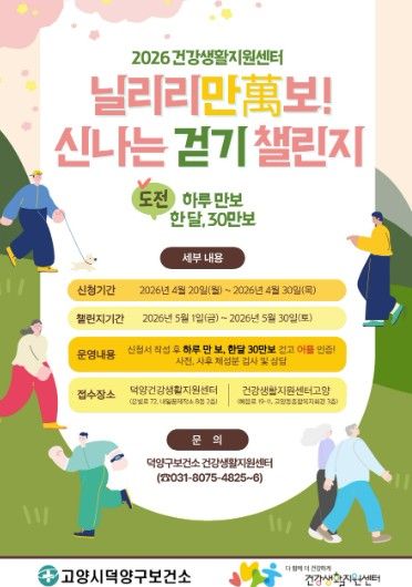 (포탈뉴스통신) 고양특례시 덕양구보건소 건강생활지원센터는 지역주민의 건강생활 실천 확산을 위한 생활밀착형 걷기 프로그램 ‘2026 닐리리만보 걷기 챌린지’를 오는 5월부터 운영을 시작한다.