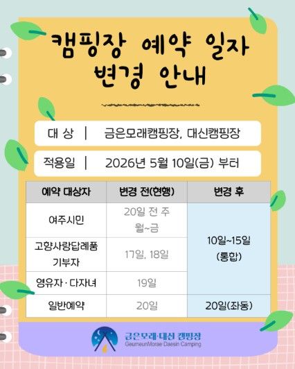 (포탈뉴스통신) 여주도시공사는 오는 5월 10일부터 이용자 중심의 고품질 서비스 제공을 위해 금은모래캠핑장, 대신캠핑장의 온라인 통합예약 일정을 대폭 간소화한다고 밝혔다.