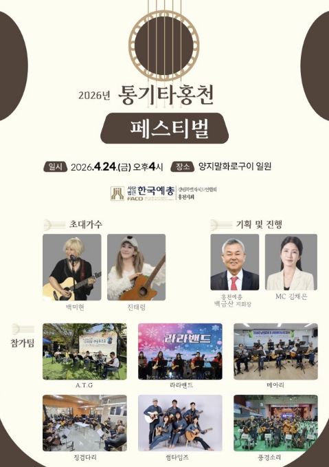 (포탈뉴스통신) (사)한국예총 홍천지회가 주관하는 2026 통기타 홍천 페스티벌이 오는 4월 24일 오후 4시 홍천 양지말화로구이 일원에서 열린다.