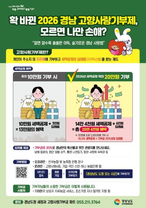 한편, 고향사랑기부제는 개인이 주민등록상 주소지를 제외한 지방자치단체에 연간 2,000만 원까지 기부할 수 있는 제도로, 기부자에게는 세액공제와 함께 기부금의 30% 이내에서 지역 특산품 등 답례품이 제공된다.