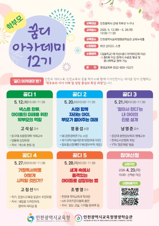 (포탈뉴스통신) 인천광역시교육청평생학습관은 23일부터 인천 관내 학부모를 대상으로 ‘2026년 학부모 꿈디 아카데미 12기’ 학습자를 모집한다.