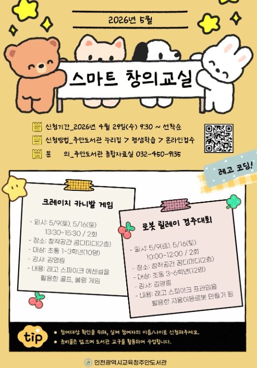 (포탈뉴스통신) 인천광역시교육청주안도서관은 4월 29일부터 관내 초등학생을 대상으로 ‘5월 스마트창의교실’ 참여자를 모집한다.