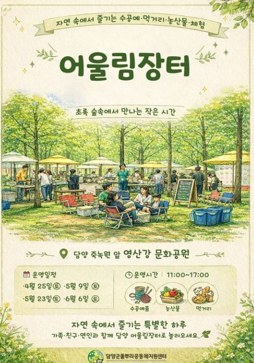 (포탈뉴스통신) 담양군 풀뿌리공동체지원센터가 지역 공동체와 소상공인의 상생을 돕고 지역 경제를 살리기 위한 ‘2026년 어울림장터’를 오는 6월까지 총 4회 운영한다.