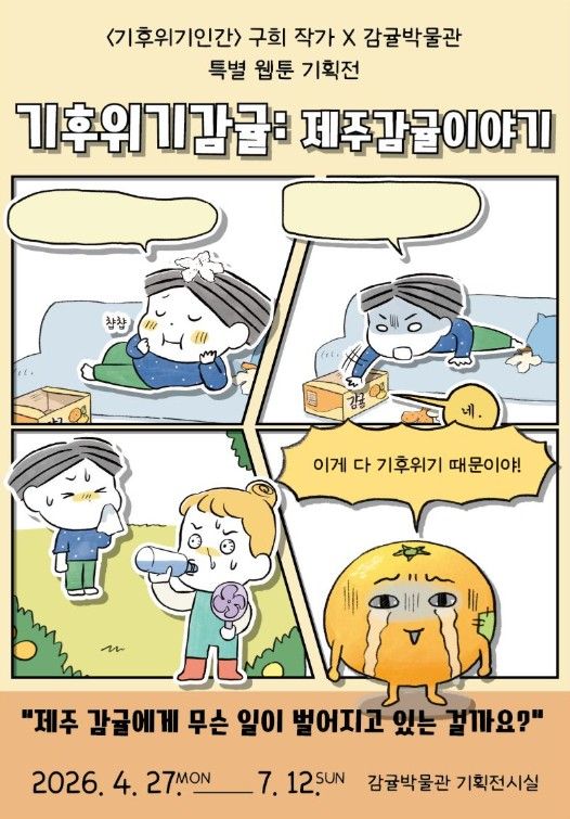 이번 전시는 2026년 감귤박물관의 첫 번째 특별기획전으로, 감귤을 매개로 전시 주제를 다각화하고 박물관의 사회적 가치를 실현하고자 마련됐다. '기후위기인간' 저자로 잘 알려진 구희 작가와 감귤박물관이 공동으로 기획·제작한 웹툰을 바탕으로 전시가 꾸며진다.